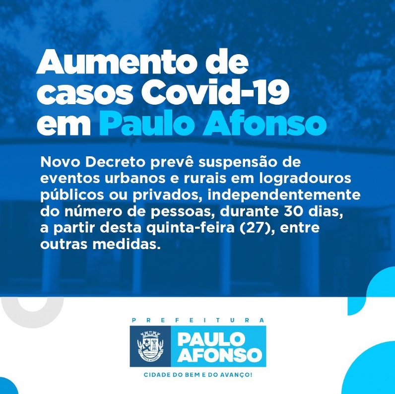 Os casos de Covid-19 em Paulo Afonso nos últimos 15 dias têm crescido em grande escala. Diante dessa realidade, que está sendo enfrentada em todo Brasil e o mundo, a Prefeitura de Paulo Afonso segue as medidas adotadas para proliferação do vírus e lança decreto que suspende todos os eventos urbanos e rurais em logradouros públicos ou privados, independentemente do número do pessoas, durante 30 dias, a partir desta quinta-feira (27).