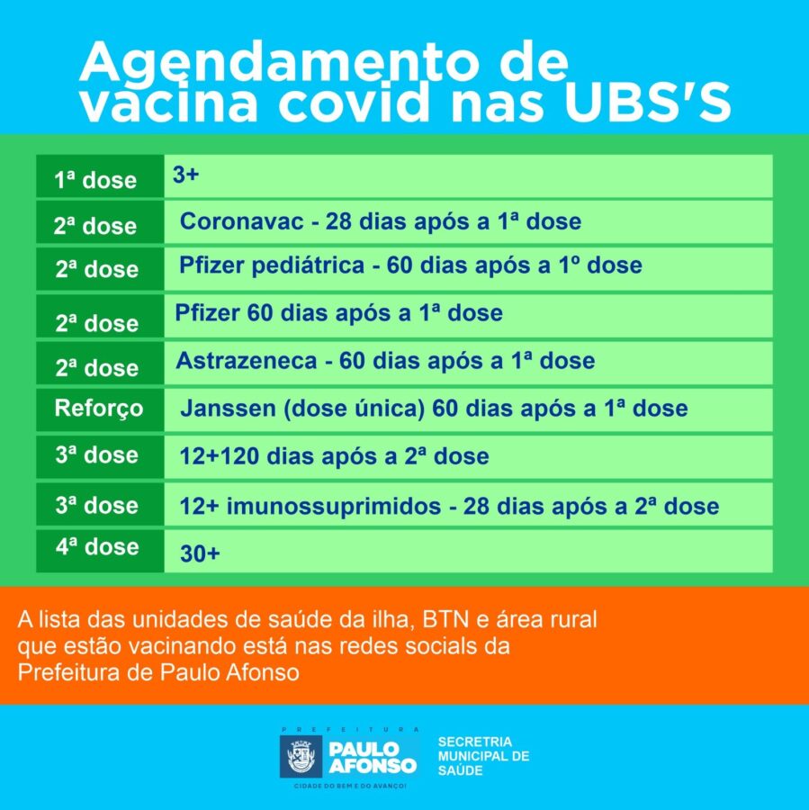 O agendamento nas Unidades Básicas de Saúde (UBS´s) também contempla: 1ª dose a partir de 3 anos, 2ª dose da Pfizer pediátrica para quem tomou a 1ª com intervalo de 60 dias; 2ª dose Coronavac 28 dias após a 1ª dose; 2ª dose Pfizer 60 dias após a 1ª; Astrazeneca 60 dias após a 1ª dose; Janssen (dose única), 60 dias após a 1ª; 3ª dose 12+ para quem tomou a 2ª dose há 120 dias, sendo que para os imunossuprimidos a 3ª será aplicada 28 dias após a 2ª dose e 4ª dose a partir de 30 anos, com intervalo de 120 dias, a partir da 3° dose.