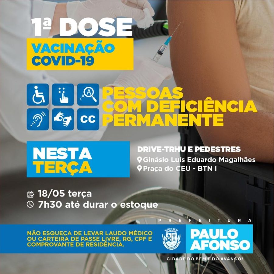 Nesta terça-feira (18), a vacinação de 1ª dose contra a covid no município tem continuidade e será destinada a pessoas com deficiência permanente a partir de 18 anos. A imunização para pedestres e quem vai de carro acontece no Ginásio Luís Eduardo Magalhães e na Praça CEU, no BTN I, das 7h30 até durar o estoque.