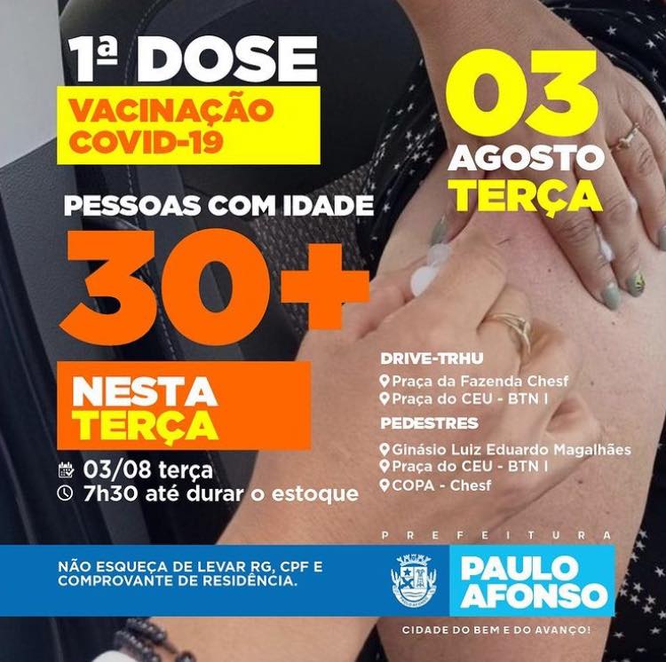 Os drives serão realizados naPraça da Fazenda Chesf e na Praça CEU, no BTN I. Para o público que preferem ir a pé, podem se dirigir ao novo ponto de vacinação no Clube Operário Paulo Afonso (COPA), no Ginásio Luís Eduardo Magalhães e Praça CEU, no BTN I.