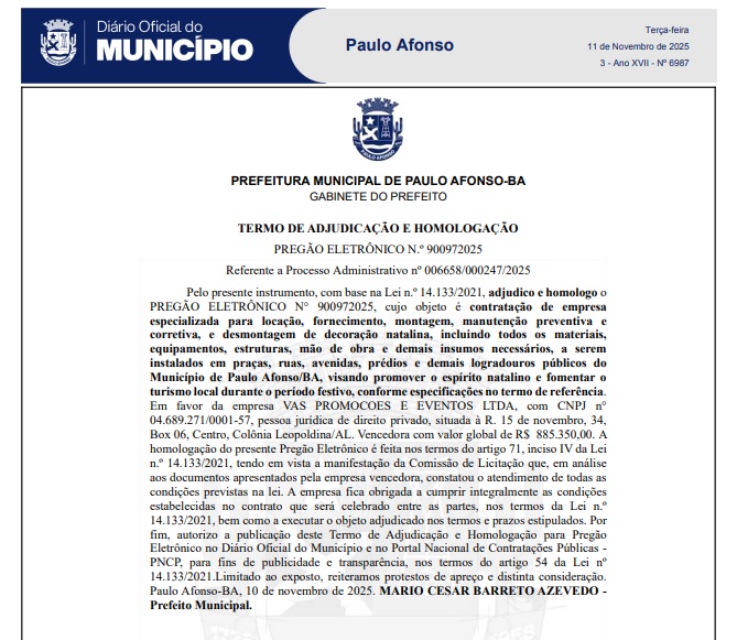 A Prefeitura de Paulo Afonso publicou, nesta terça-feira, 11 de novembro, no Diário Oficial do Município, a homologação do Pregão Eletrônico que trata da contratação de empresa especializada para locação, fornecimento, montagem, manutenção preventiva e corretiva, além da desmontagem da decoração natalina deste ano.