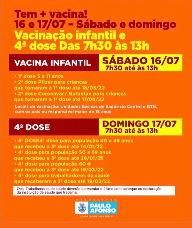A vacinação contra a Covid-19 em Paulo Afonso segue neste sábado (16) e domingo (17) com a aplicação da vacinação infantil e 4ª dose.