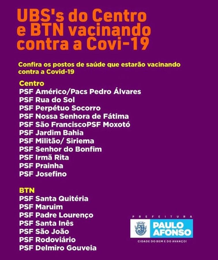 Veja como será a vacinação contra covid-19 no final de semana em Paulo Afonso