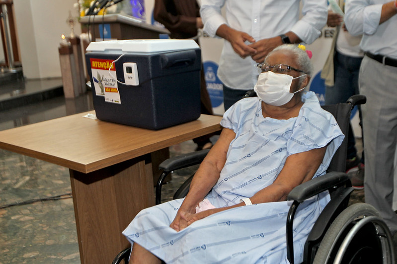 “Estou muito feliz de ser a primeira idosa a receber a vacina aqui na Bahia”, celebrou a idosa.
