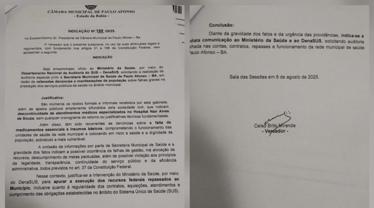 A proposição foi protocolada em 8 de agosto de 2025 e solicita imediata comunicação ao Ministério da Saúde e ao DenaSUS para apuração detalhada das contas, contratos e funcionamento da rede municipal de saúde de Paulo Afonso.