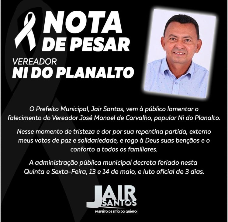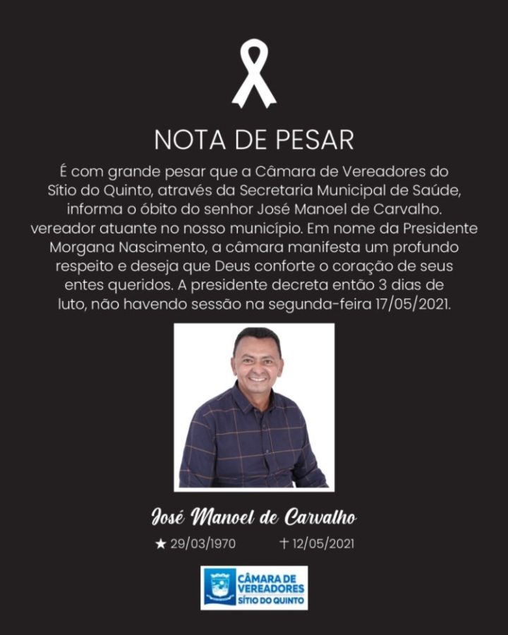 O vereador de Sítio do Quinto, município do território Semiárido Nordeste II, José Manoel de Carvalho, 51 anos, popularmente conhecido como Ni do Planalto (PSB) morreu na noite desta quarta-feira, 12, por complicações da Covid-19. Ele estava internado no Hospital Municipal de Antas e aguardava transferência para Unidade de Terapia Intensiva UTI em outro município.
