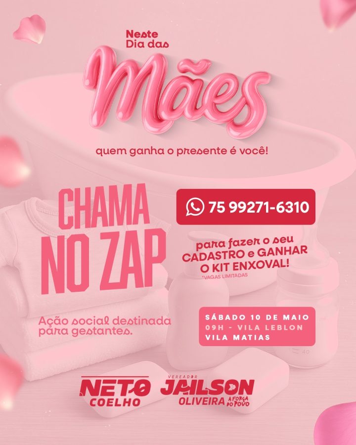 Em celebração ao Dia das Mães, o vereador Jailson Oliveira e o empresário Neto Coelho promovem a entrega de kits de enxoval para gestantes, como forma de acolher e apoiar mães em um momento tão especial.