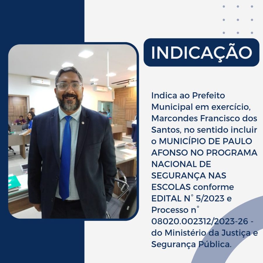 O vereador Jean Roubert (PSD) solicitou ao Executivo Municipal através da indicação n°125/2023 que seja providenciado incluir o município de Paulo Afonso no Programa Nacional de Segurança nas Escolas, conforme recente edital do Ministério da Justiça e Segurança Pública.