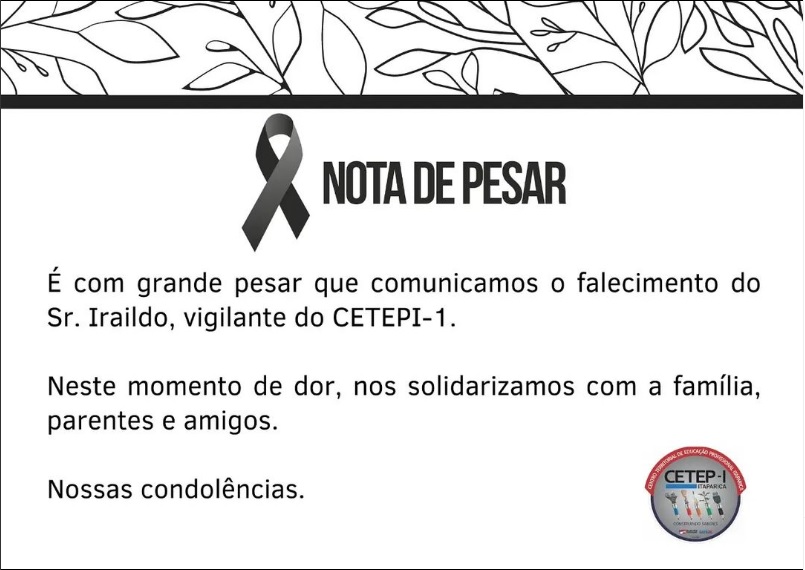 “É com grande pesar que comunicamos o falecimento da Sr. Iraildo, vigilante do CETEPI-1. Neste momento de dor, nos solidarizamos com a família, parentes e amigos. Consequentemente fica decretado Luto Oficial e aulas no formato assíncrono, dia 14 de dezembro”, publicou a instituição de ensino em suas redes sociais.