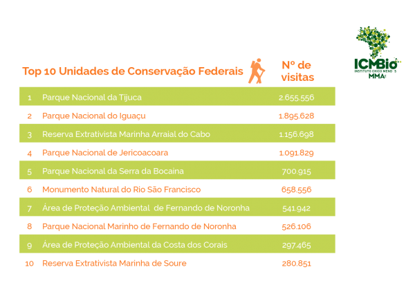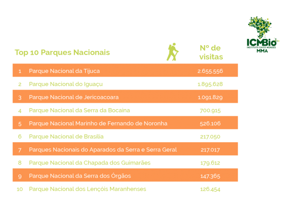 O campeão da visitação, com 2,6 milhões de visitas, continua sendo o Parque Nacional da Tijuca (RJ). O Parque Nacional do Iguaçu (PR) ficou em segundo lugar, seguido pelo Parque Nacional de Jericoacoara (CE) tendo, respectivamente, 1,89 milhão e 1,09 milhão de visitas.