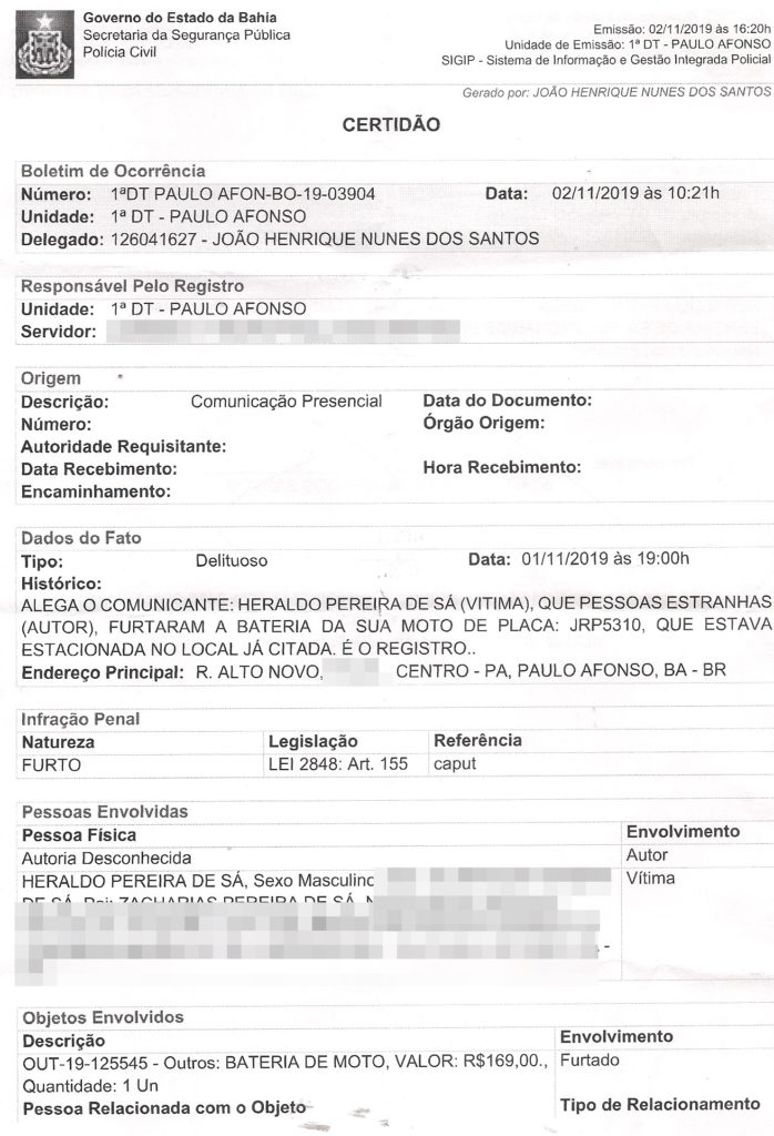 Para Eraldo, os autores do crime agiram com audácia, uma vez que o veículo estava a pouco mais um metro da frente da casa: “Os noias foram muito audaciosos porque a moto estava a 1 metro e meio em frente ao portão e tiveram a audácia de roubar minha bateria. O pior é que só fui perceber no dia 02/11/2019, pois a mesma não ligava de jeito algum e tive que deixar na casa de meu pai.”