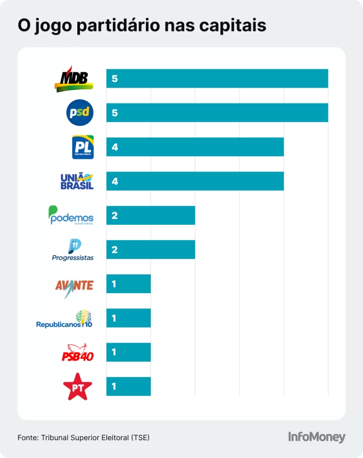 Nos municípios de maior porte, o chamado “G-103”, o PL lidera com 16 prefeituras, seguido pelo PSD (15), União Brasil (13) e MDB (12). Nas capitais, PSD e MDB dividem o protagonismo, cada um elegendo cinco prefeitos, seguidos por PL e União Brasil, com quatro cada, e Progressistas e Podemos, com dois representantes.
