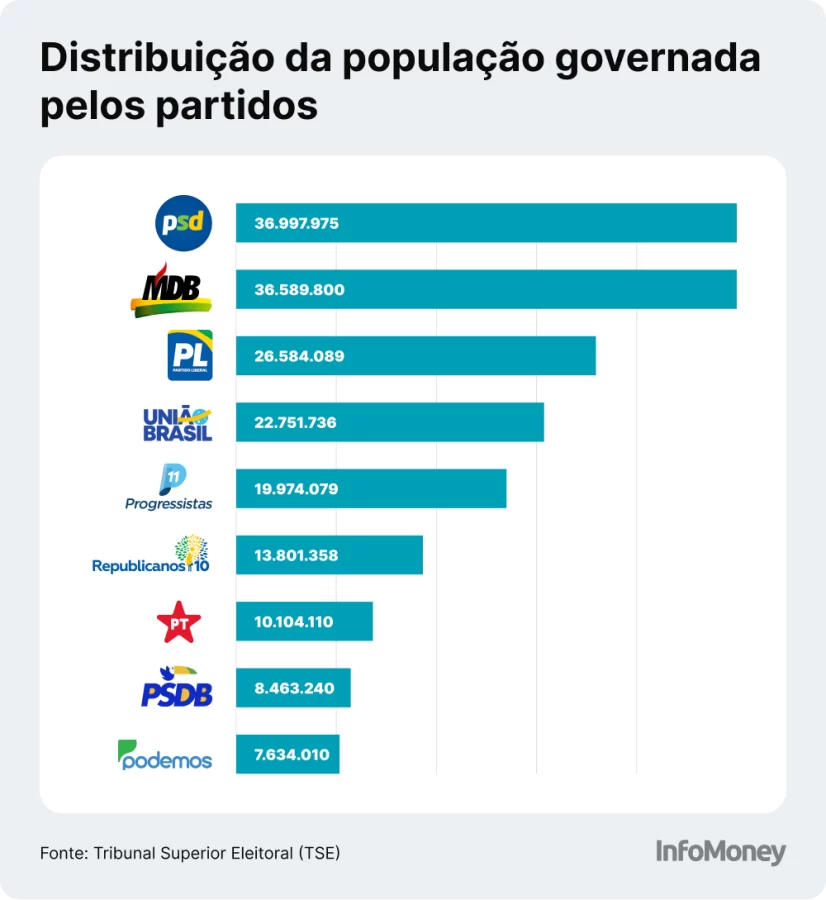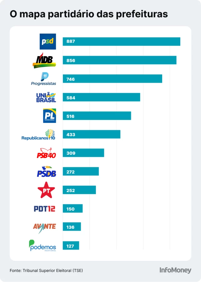 Apesar do crescimento de 8% do MDB, que passou a controlar 856 prefeituras, o PSD superou pela primeira vez o partido em capilaridade, algo que não ocorria há pelo menos 20 anos. Em terceiro lugar, o Progressistas, partido do presidente da Câmara dos Deputados, Arthur Lira (PP-AL), aumentou sua presença de 690 para 746 municípios.